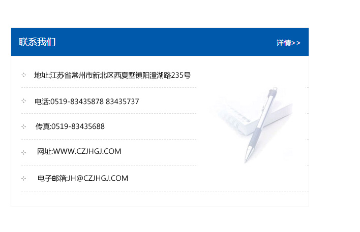 地址:常州市新北區友邦商務大廈1幢16、17層  電話:0519-85101652  傳真:0519-85112595  郵編:213022  網址:www.cz-jiayue_cn.komoricm.com  郵箱:xiajifengaa@163.com